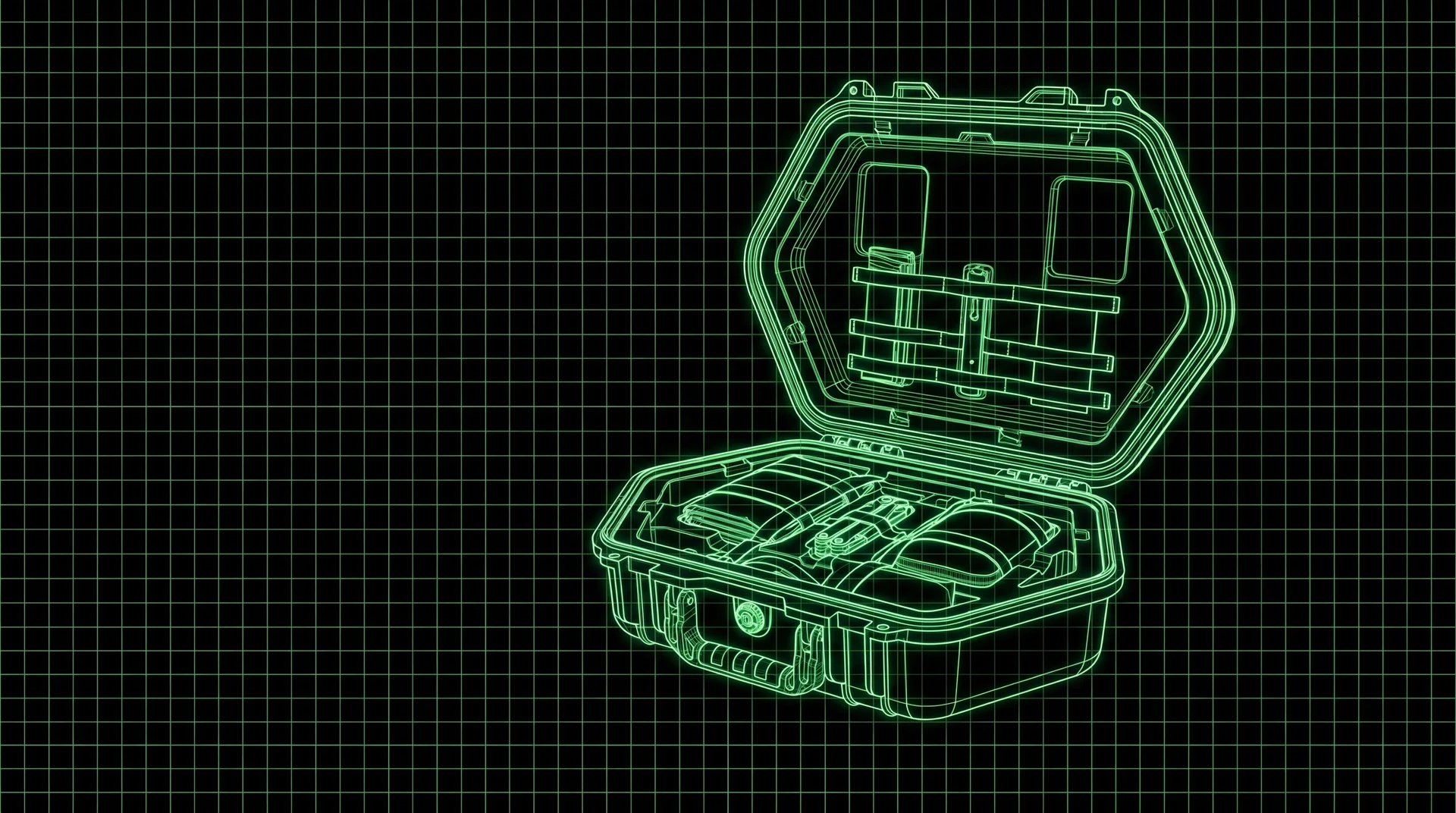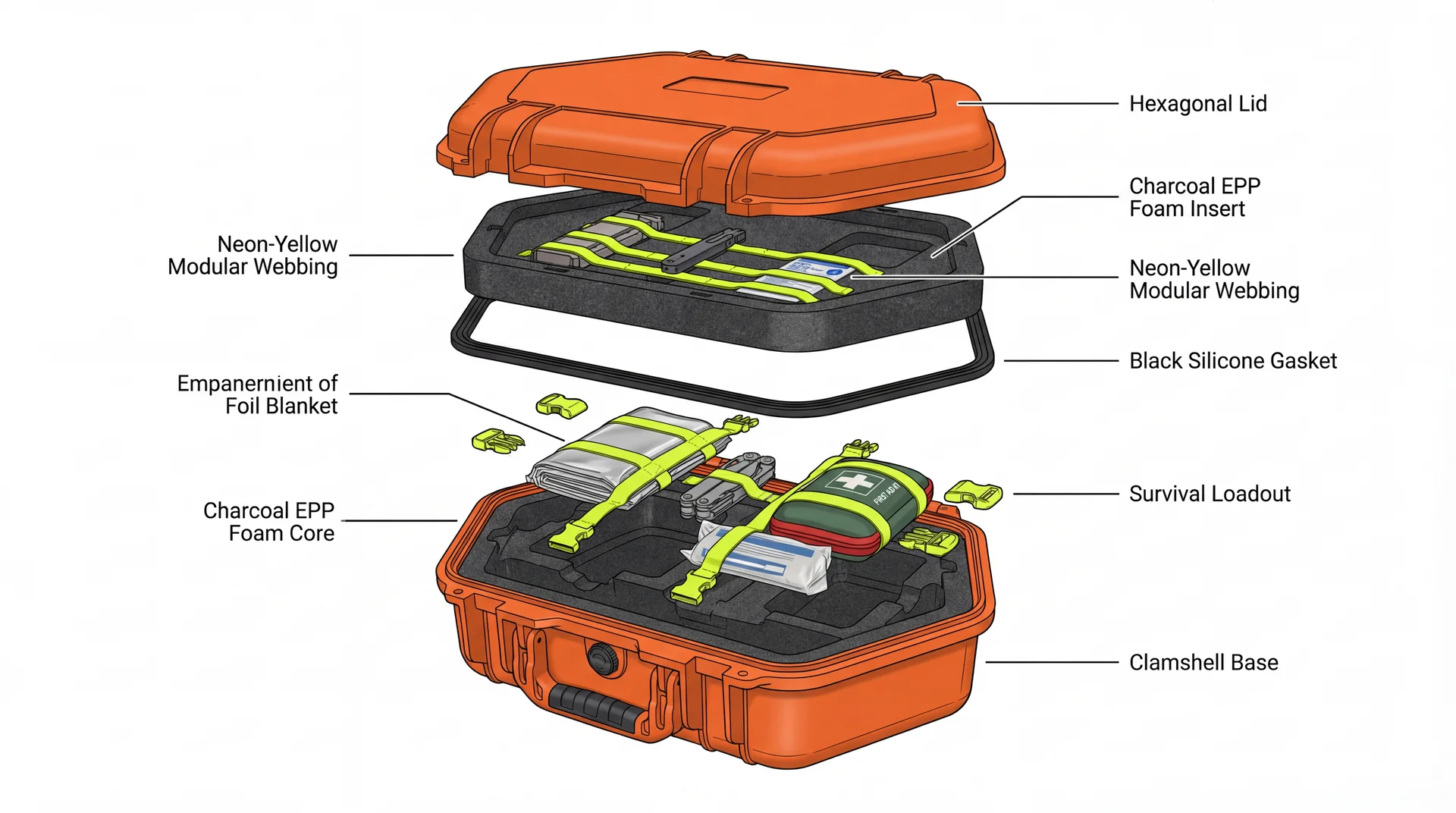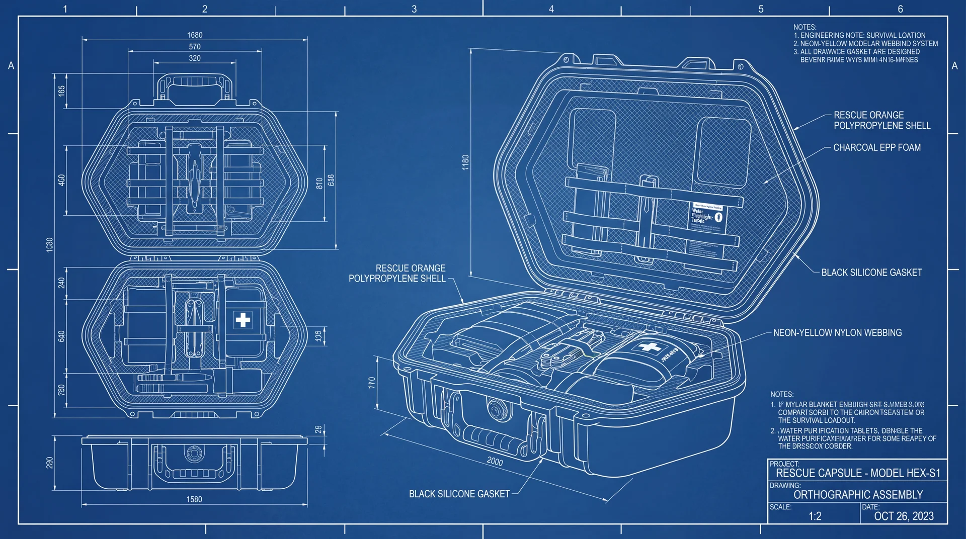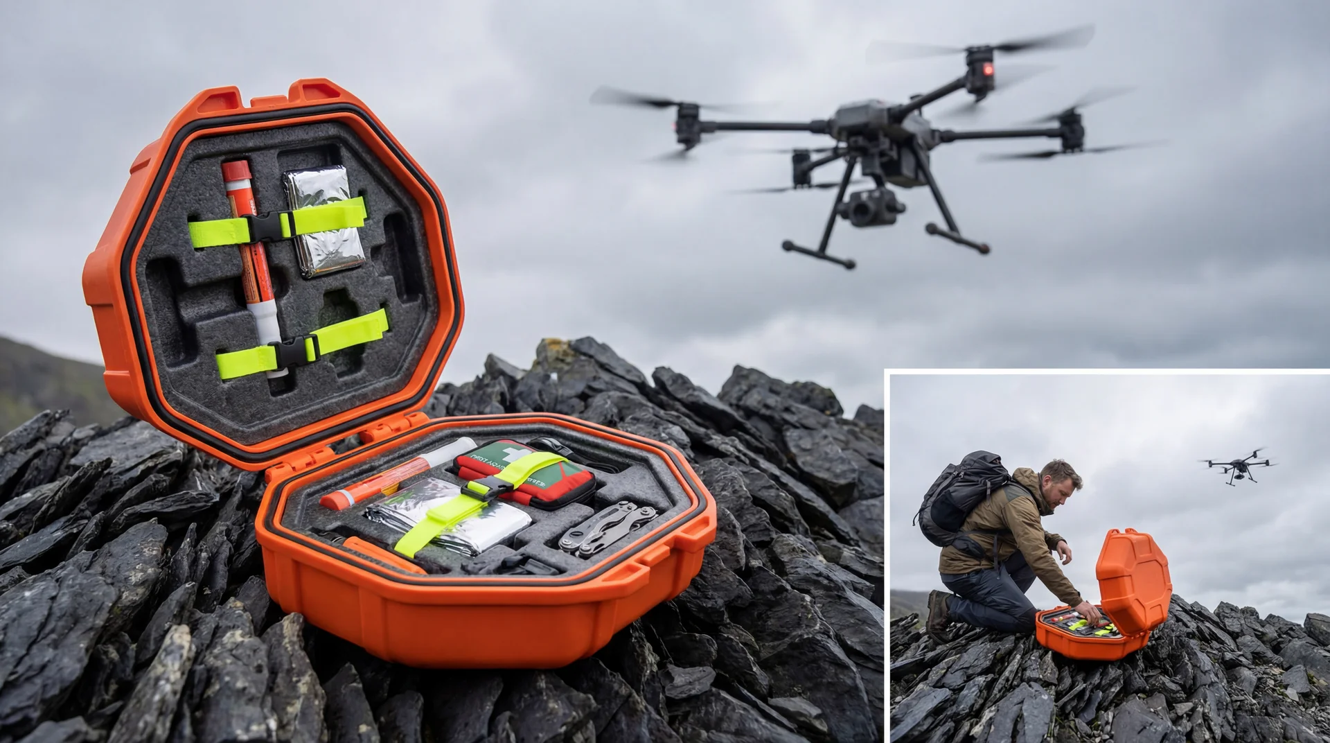 The AeroDrop Vanguard is a ruggedized, drone-deployable supply pod designed for rapid aerial delivery of critical adventure and survival gear. Utilizing a hybrid construction of a rotomolded LLDPE outer shell and an expanded polypropylene (EPP) shock-absorbing core, the pod ensures payload integrity upon impact. This view reveals the clamshell interior organization, where a modular webbing system secures the payload within the shock-absorbing foam core, bridging the gap between military airdrop logistics and civilian adventure support.
