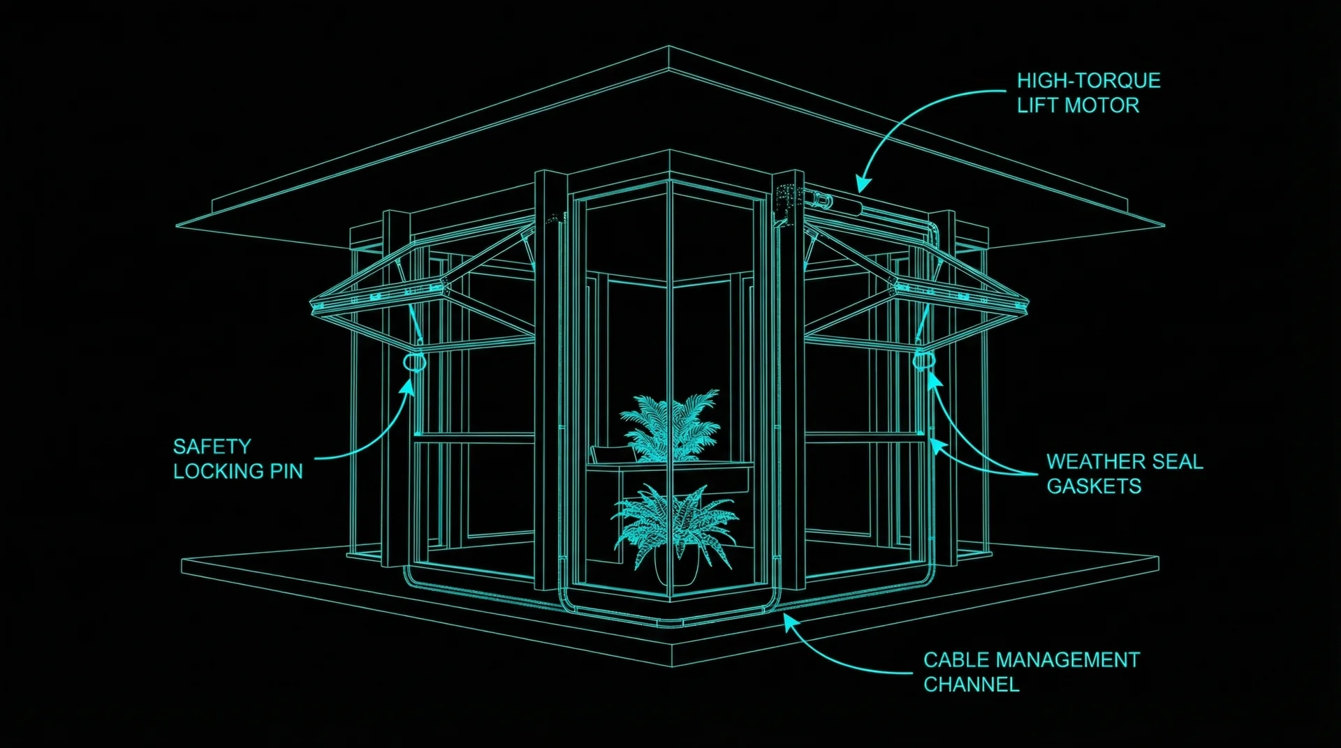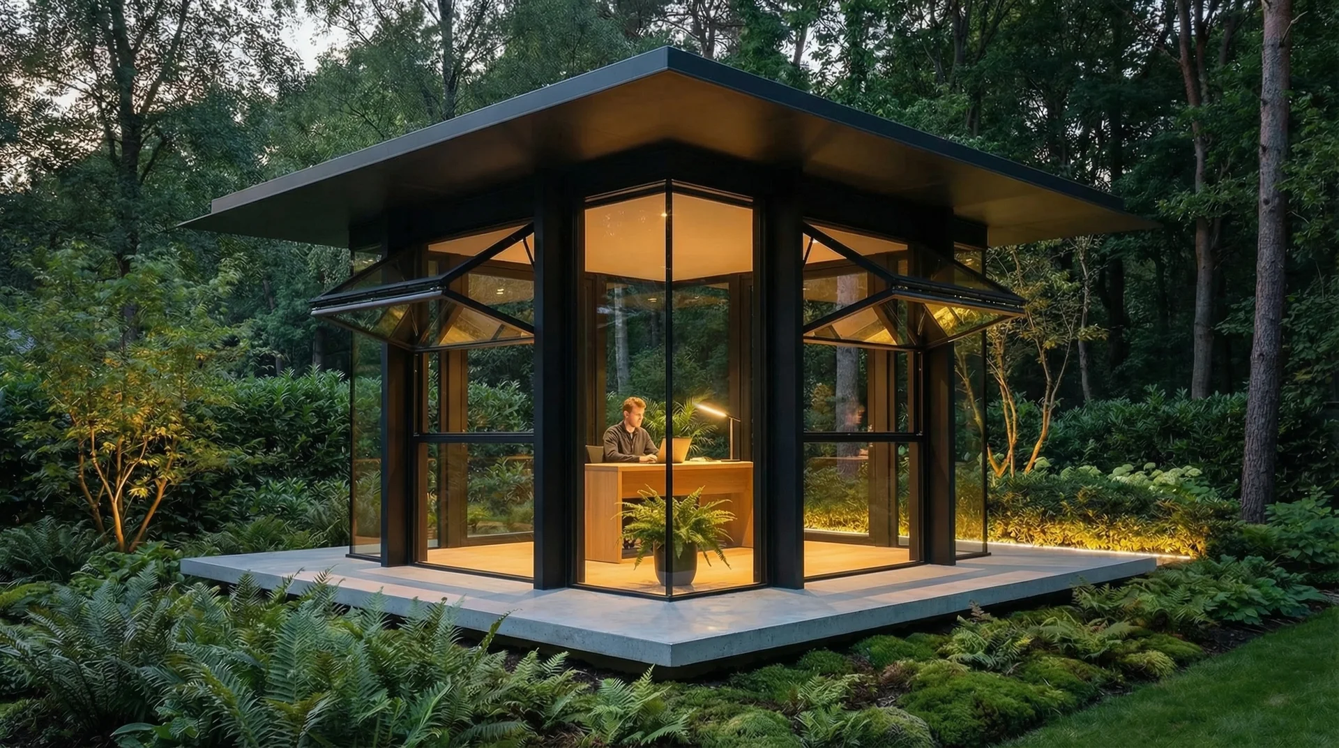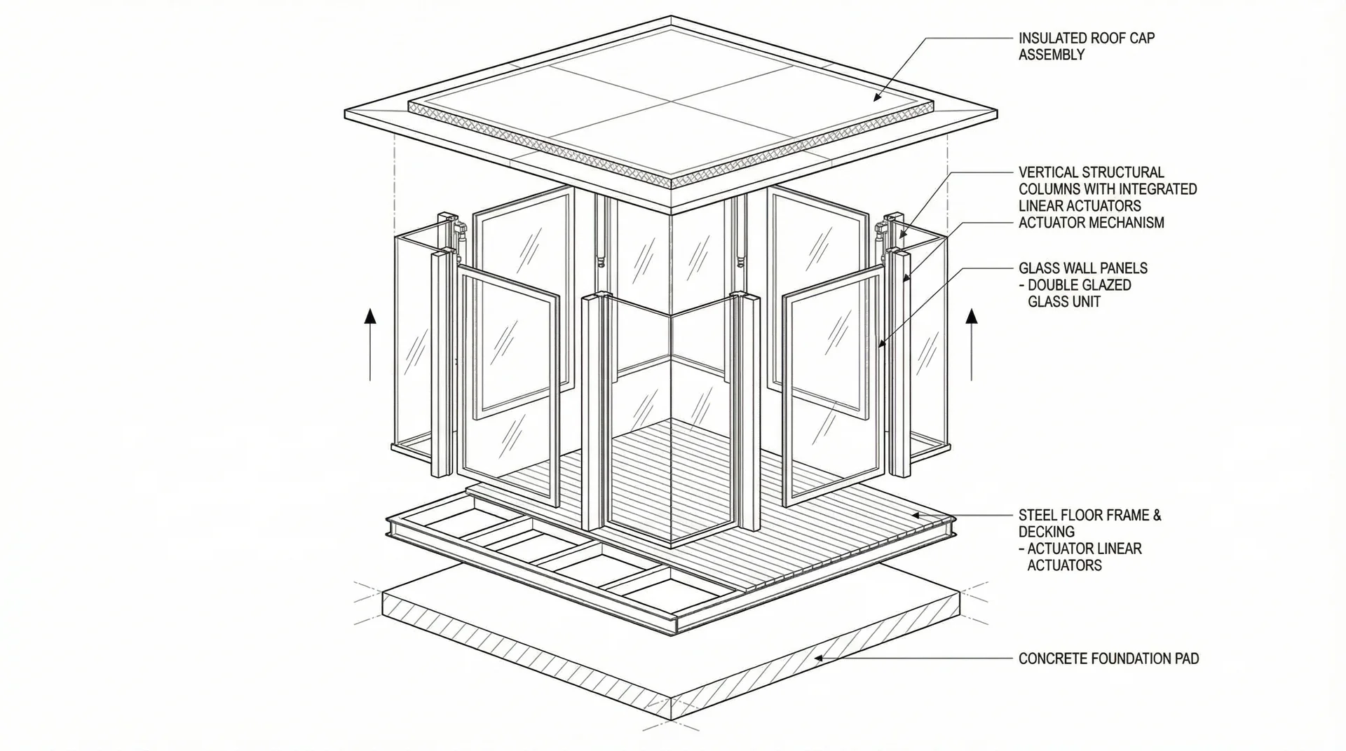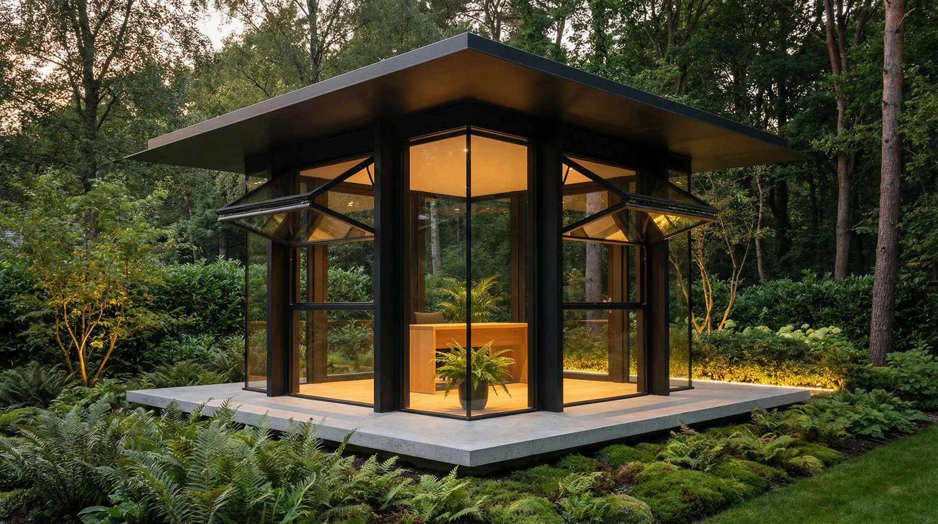 The AeroVista Pavilion is a prefabricated, modular office pod featuring a proprietary 'Vertical-Glide' fenestration system. Unlike traditional pods, all four tempered glass walls are engineered to lift vertically via concealed linear actuators housed in the structural columns, transforming a sealed, climate-controlled workspace into an open-air gazebo in under 20 seconds. This architectural solution addresses the market need for biophilic design by eliminating the physical barrier between the user and the outdoors without compromising on weatherproofing or security when closed.