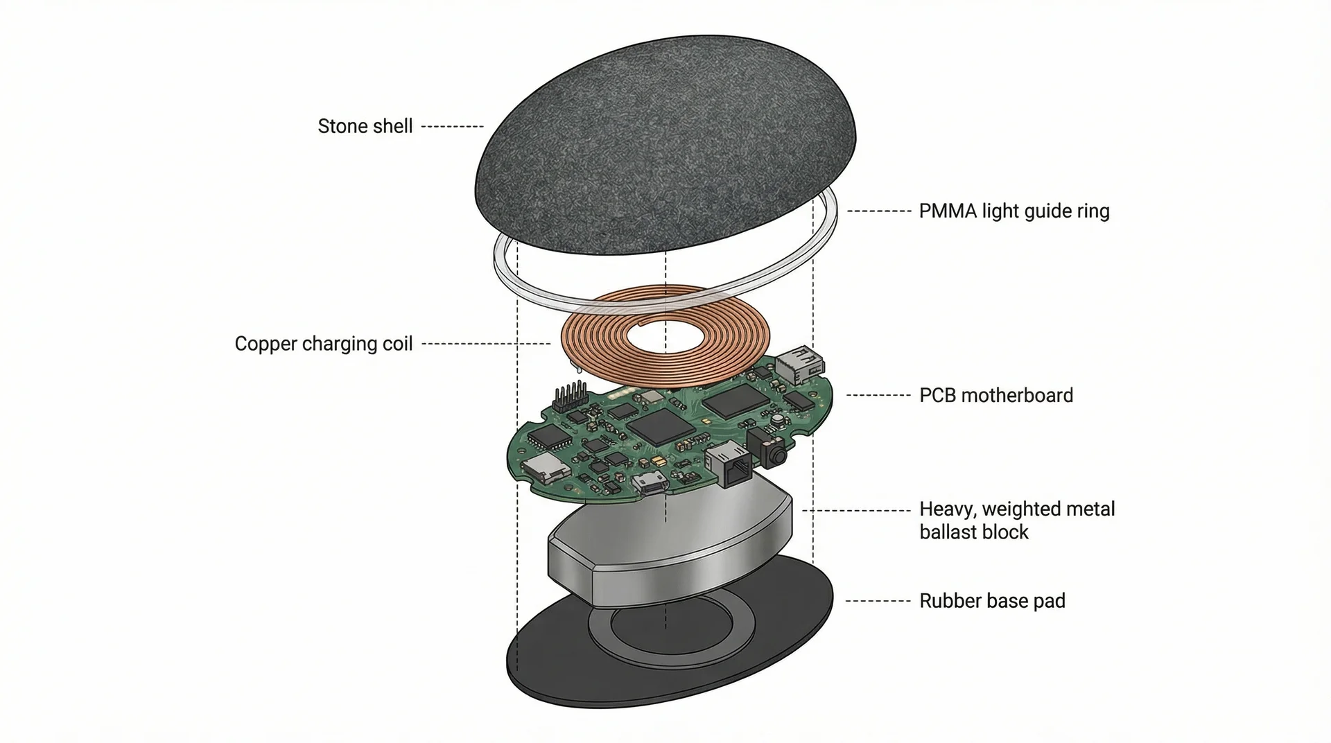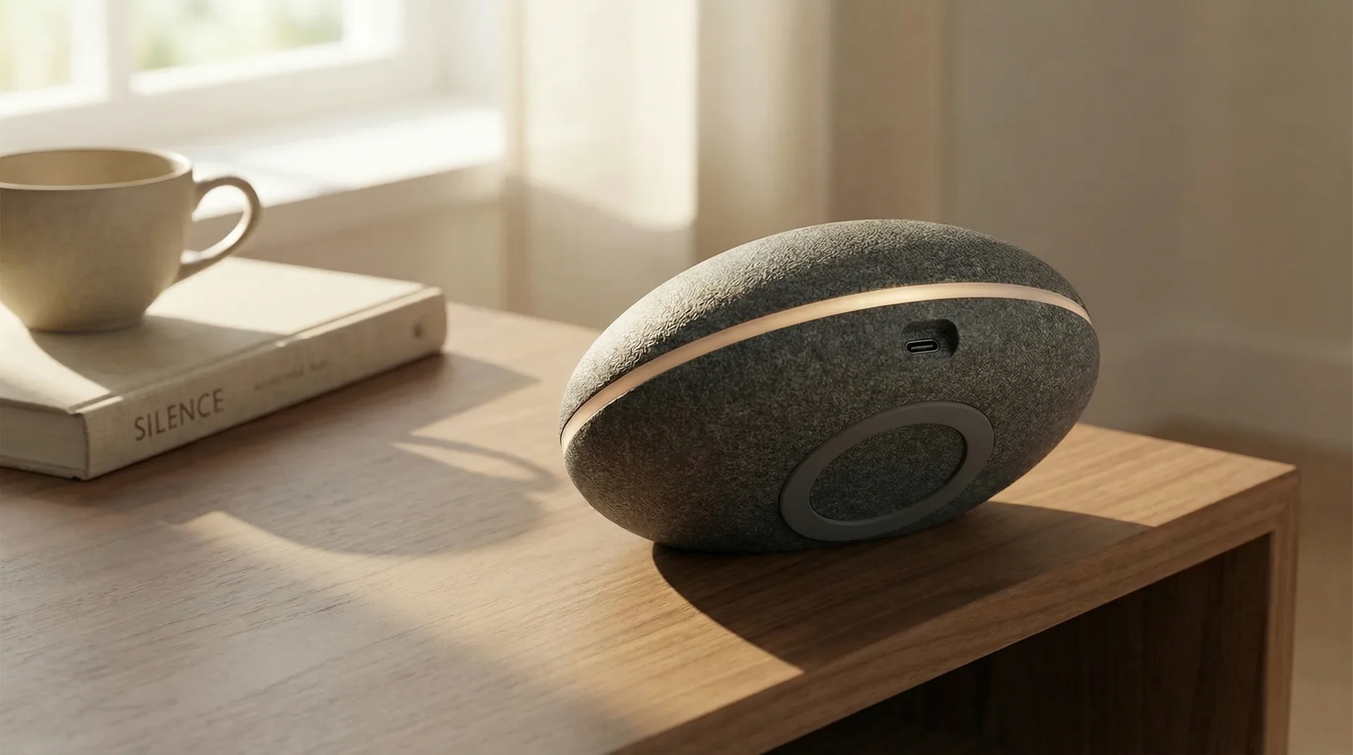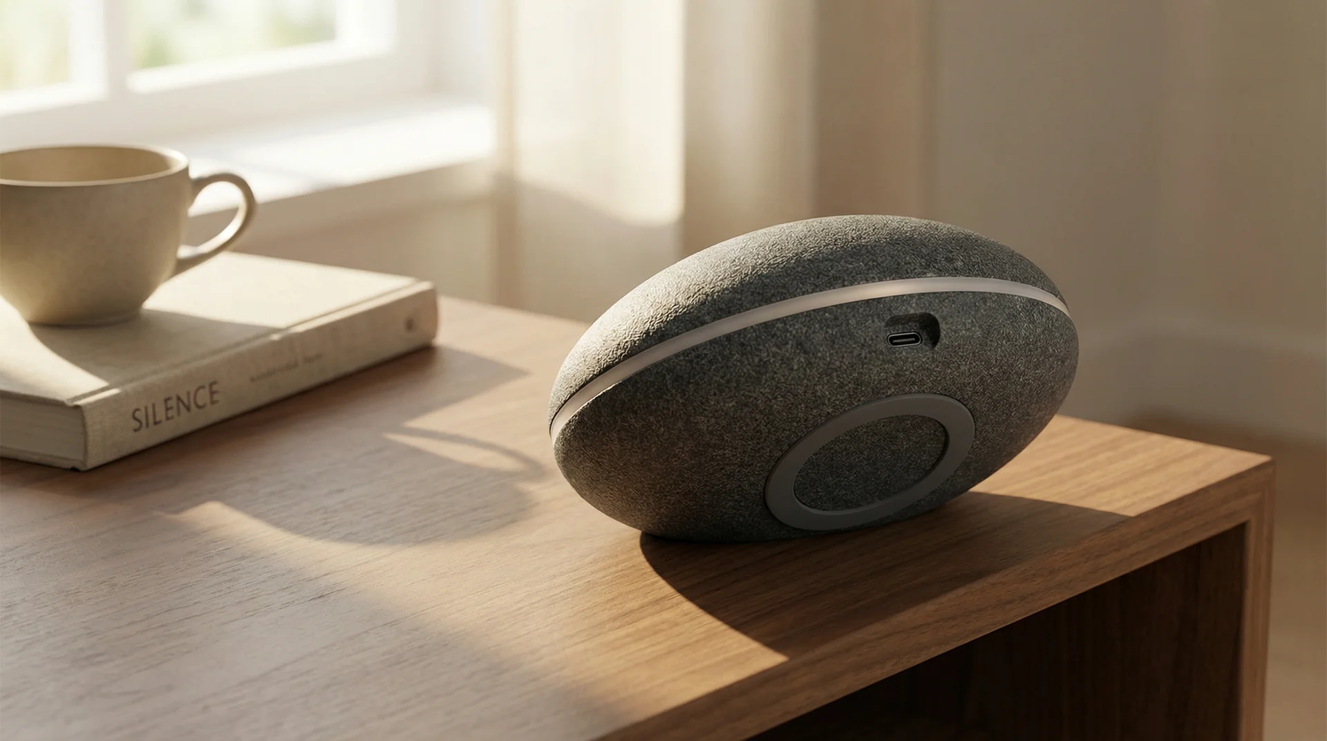 The Lithos Glow is a 15W Qi-certified wireless charging pad designed to mimic the organic, asymmetrical form of a polished river stone. It integrates a hidden sub-surface LED array that emits a rhythmic, warm 'breathing' light through a translucent equatorial seam to indicate charging status, blending high-speed technology seamlessly into minimalist interior decor.