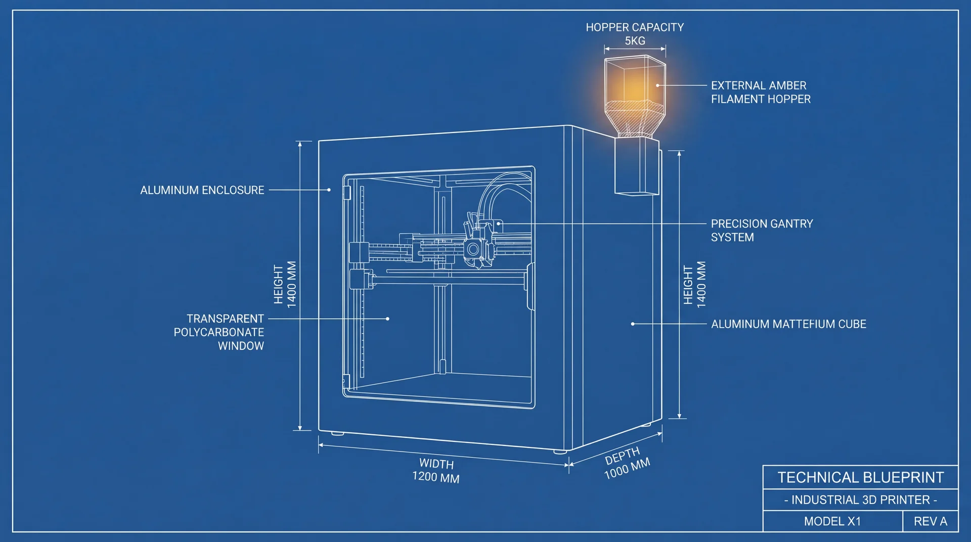 The Monolith FX-1000 is a large-format, pellet-fed 3D printer designed to bridge the gap between industrial manufacturing and bespoke furniture design. By utilizing a high-flow pellet extrusion system, it reduces material costs by up to 90% compared to filament-based printers while offering a massive 1.2m³ build volume. Engineered for designers and micro-factories, it enables the rapid production of full-scale chairs, tables, and architectural elements in hours, not days.