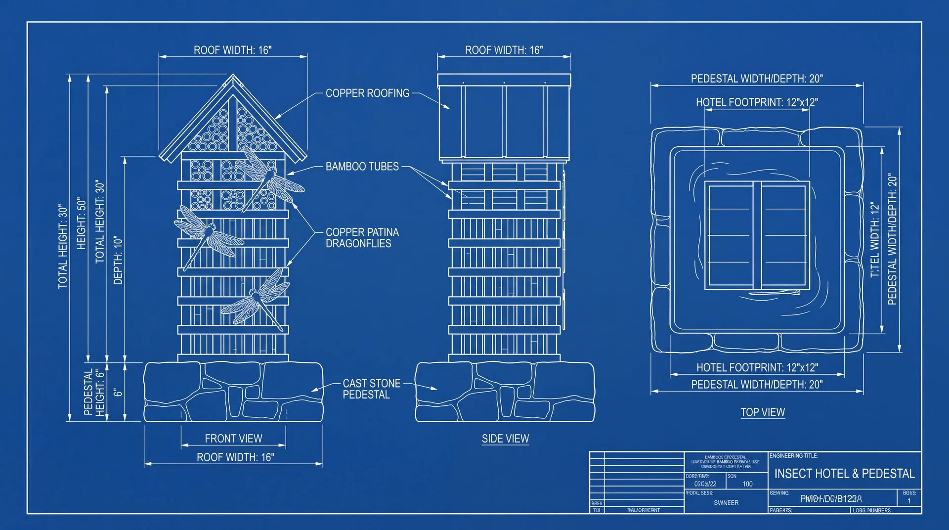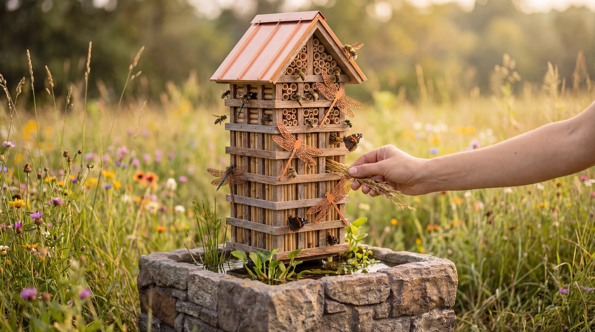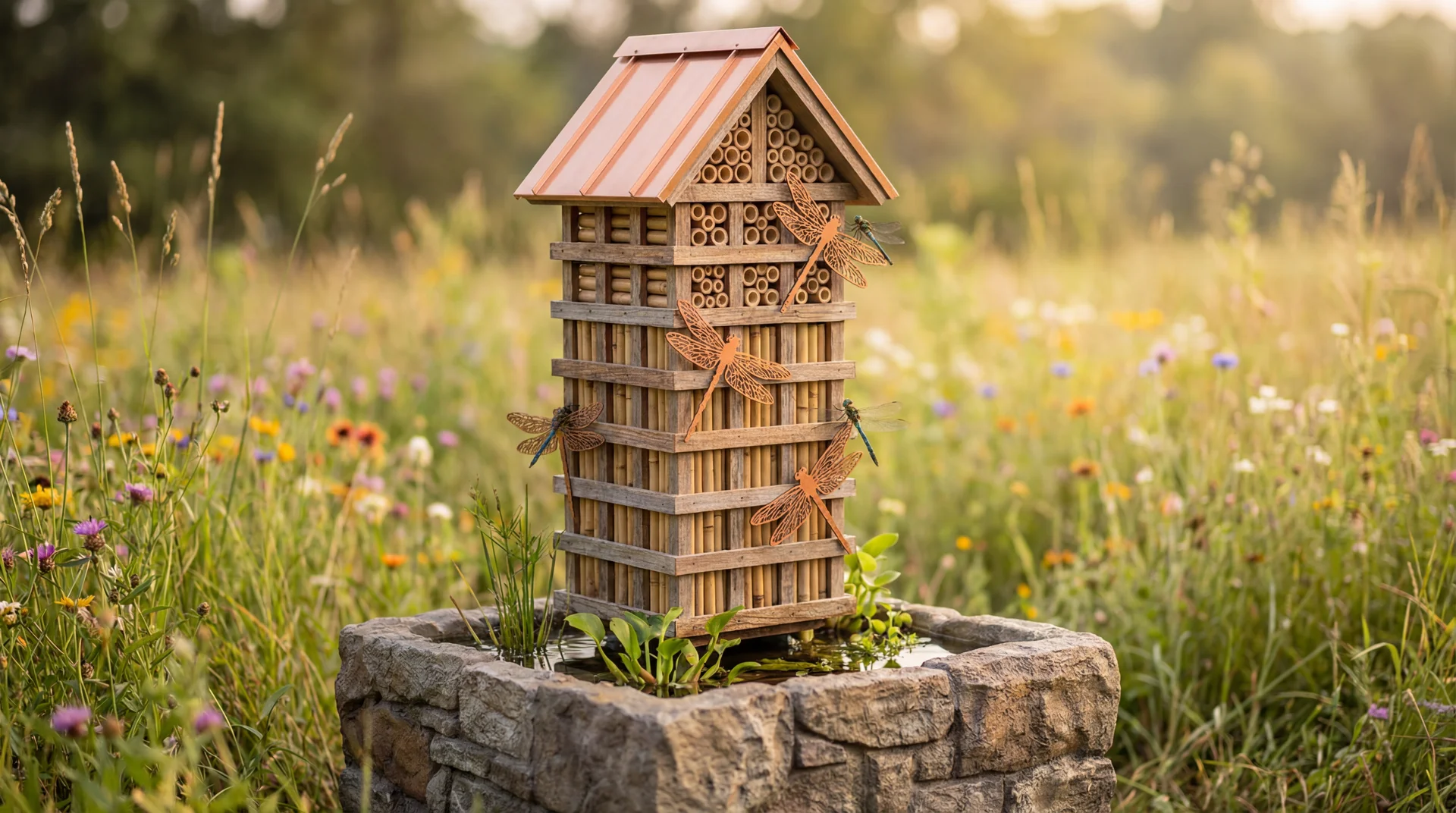 Odonata Keep is a hybrid aquatic habitat and insect sanctuary designed to attract and breed dragonflies for natural mosquito control. Merging the functionality of a breeding pond with the aesthetic of a high-end 'bird hotel,' this unit features a self-sustaining aquatic basin for nymphs and a multi-story wooden superstructure for adults. The vertical tower provides crucial roosting slots, sunning perches, and protection from weather, while the decorative dragonfly motifs act as visual lures. It transforms a functional biological defense system into a charming, rustic architectural garden feature.