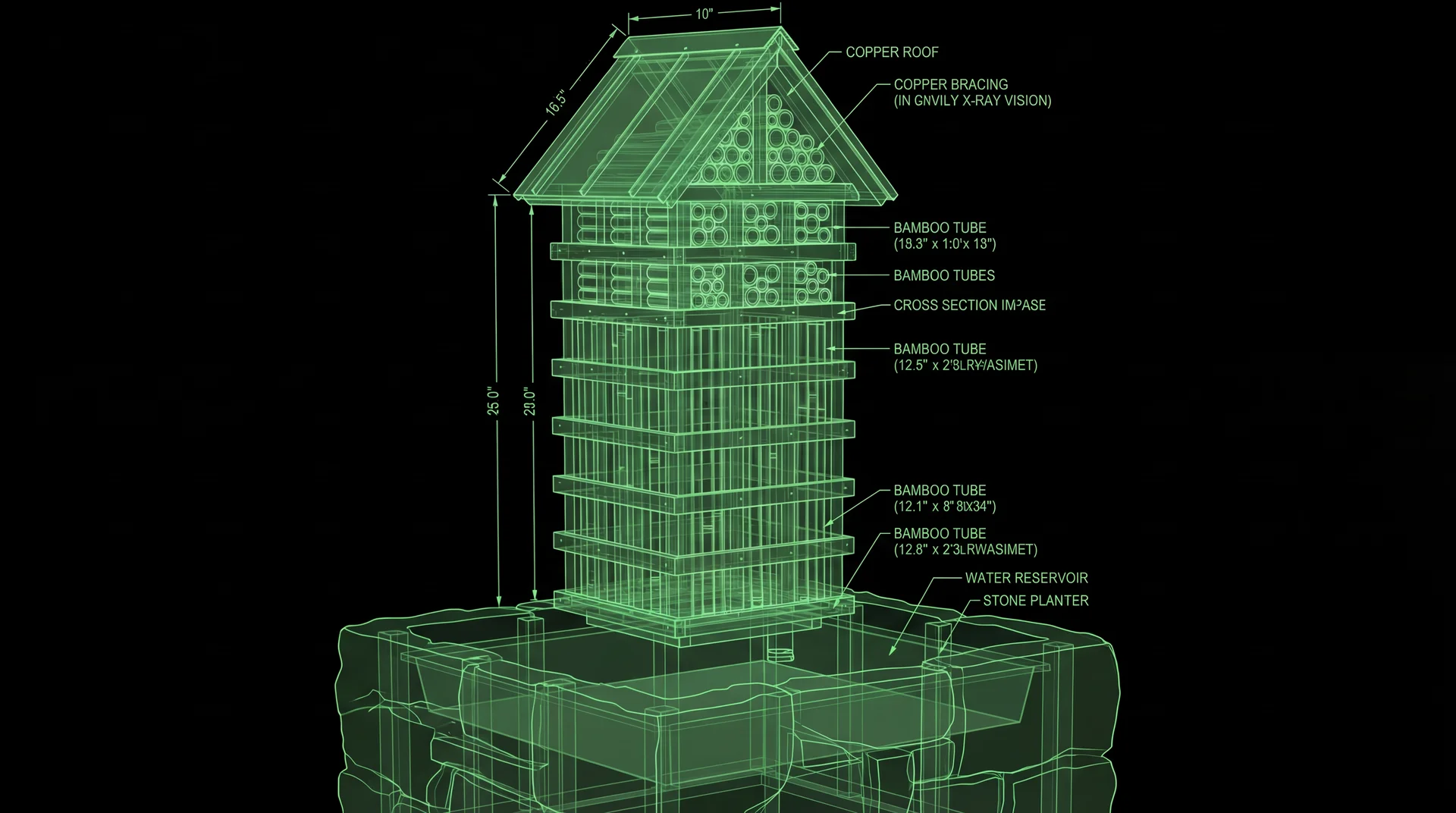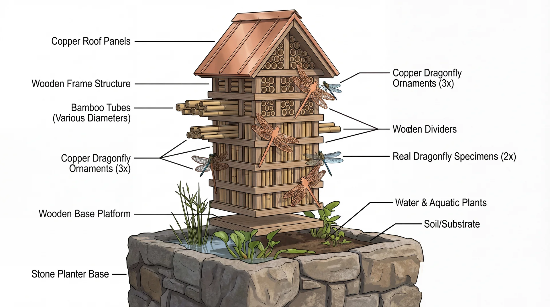 | Biological Zones | Aquatic Nymph Zone (Basin) + Aerial Roosting Zone (Tower) |