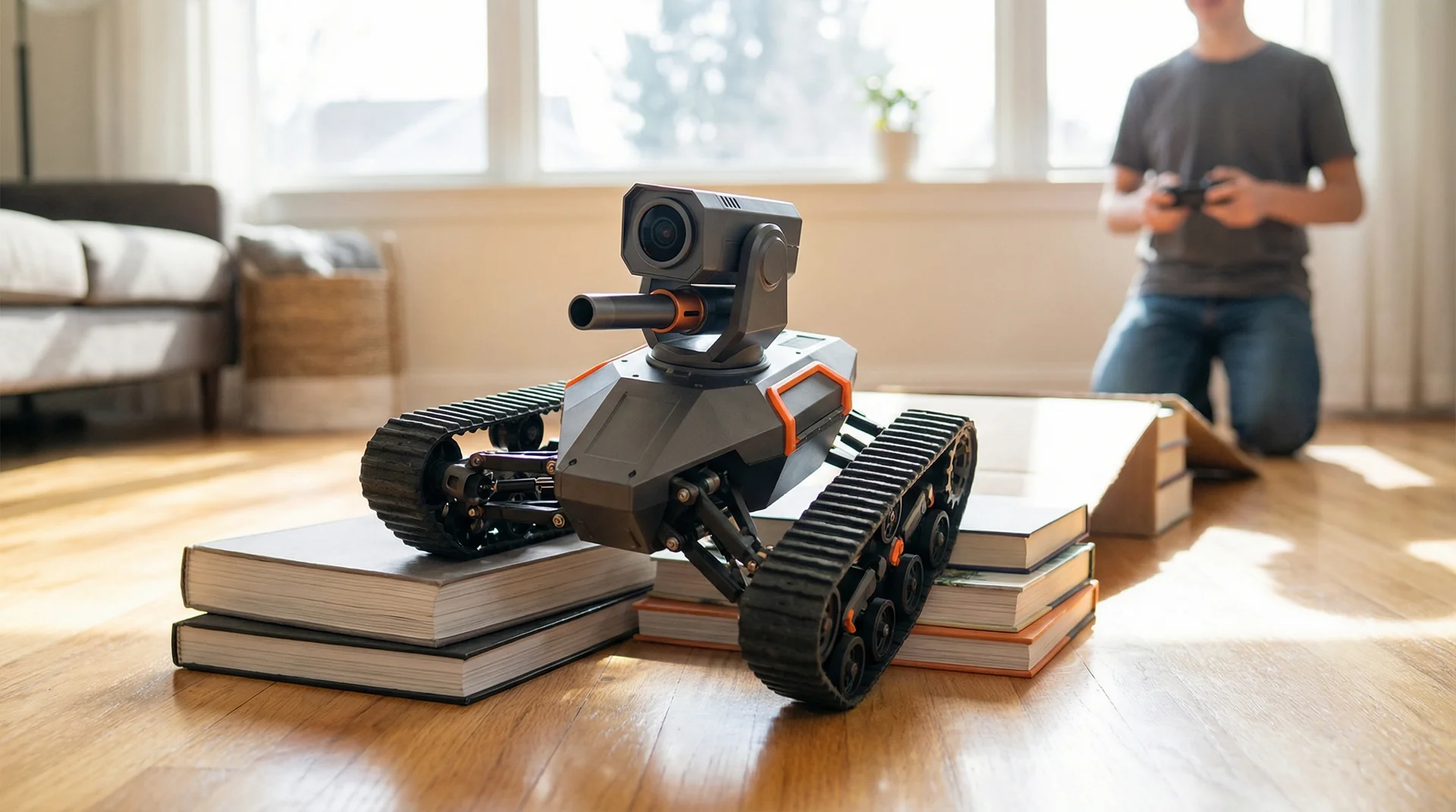 The Vanguard MK-II is an app-controlled FPV (First Person View) tracked vehicle designed for the hobbyist market, featuring a modular turret system that allows users to swap between a 6mm airsoft BB mechanism and a foam dart launcher. Leveraging a direct Wi-Fi connection for low-latency video streaming and control, the device bridges the gap between toy-grade RC cars and hobby-grade robotics.