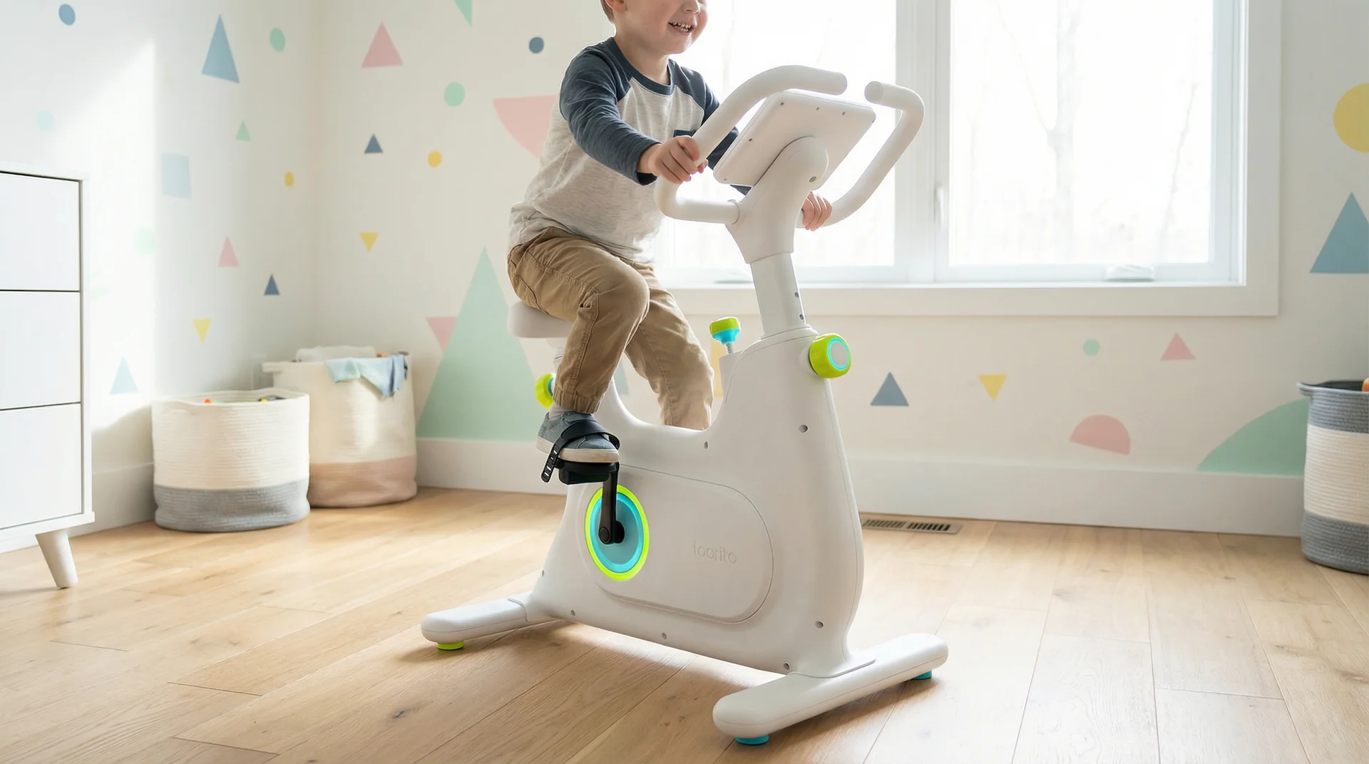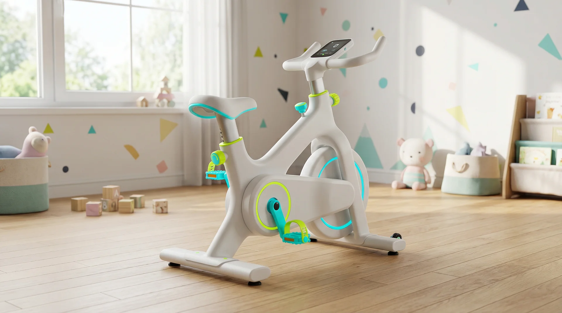 The VoltRider Mini is a kinetic-energy-harvesting stationary bicycle designed for children aged 5-10, where the mechanical energy of pedaling is converted into electricity to power an integrated interactive display. This self-sustaining system utilizes a high-efficiency DC dynamo and supercapacitor buffer to gamify physical fitness, requiring constant motion to keep the educational software and games running. The product combines safety-focused industrial design with renewable energy education.